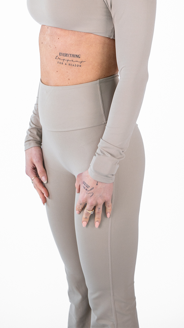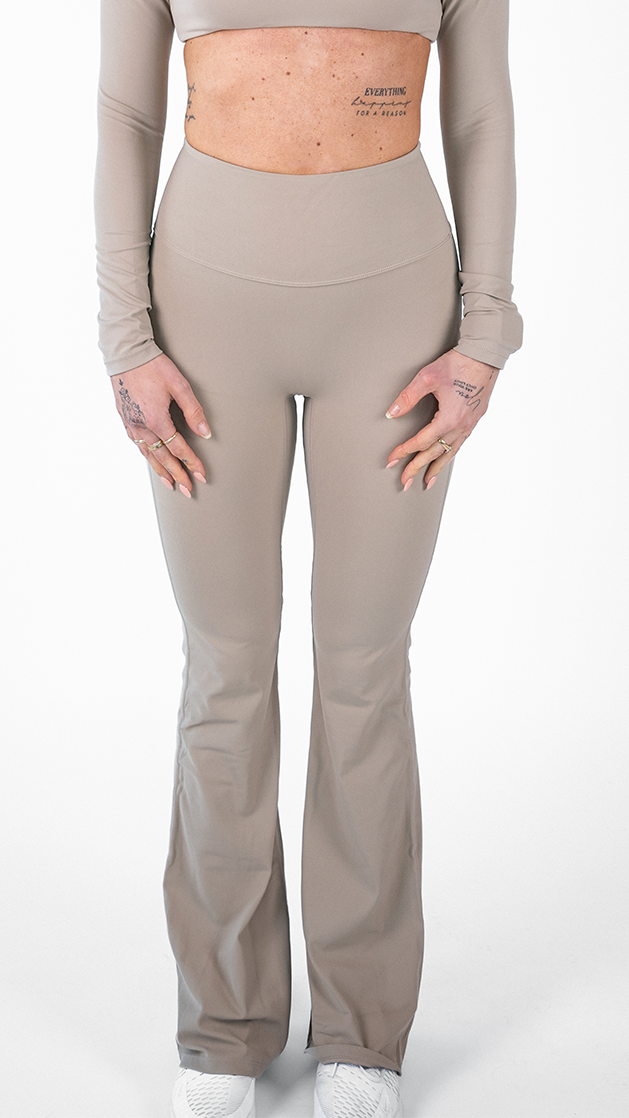 Découvrez le Legging Joyce Flair, la variante chic et tendance de notre populaire ensemble Joyce. Le pantalon « Flair » à taille haute présente une coupe évasée ultra tendance, affinant la taille et allongeant la silhouette avec élégance.