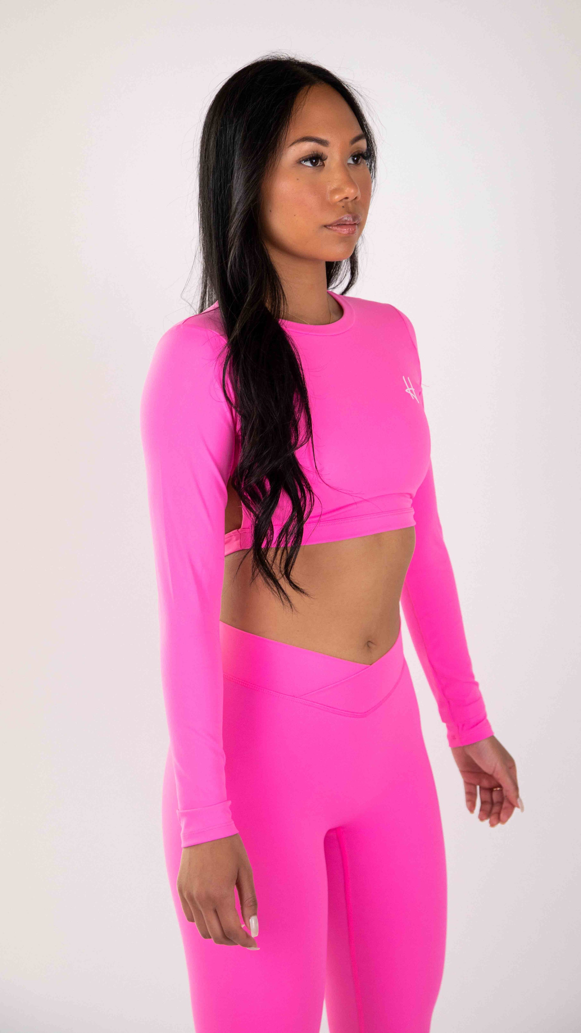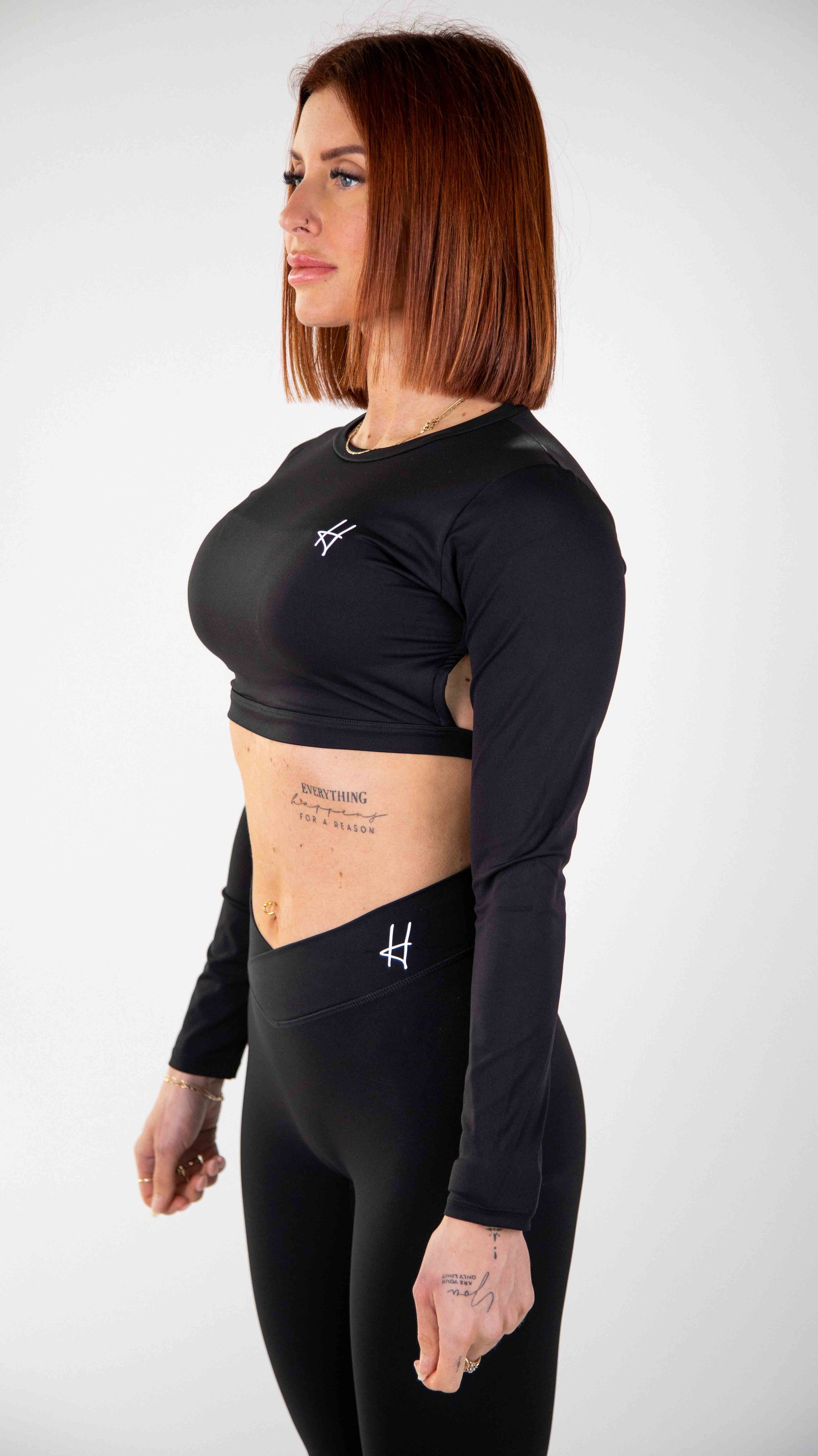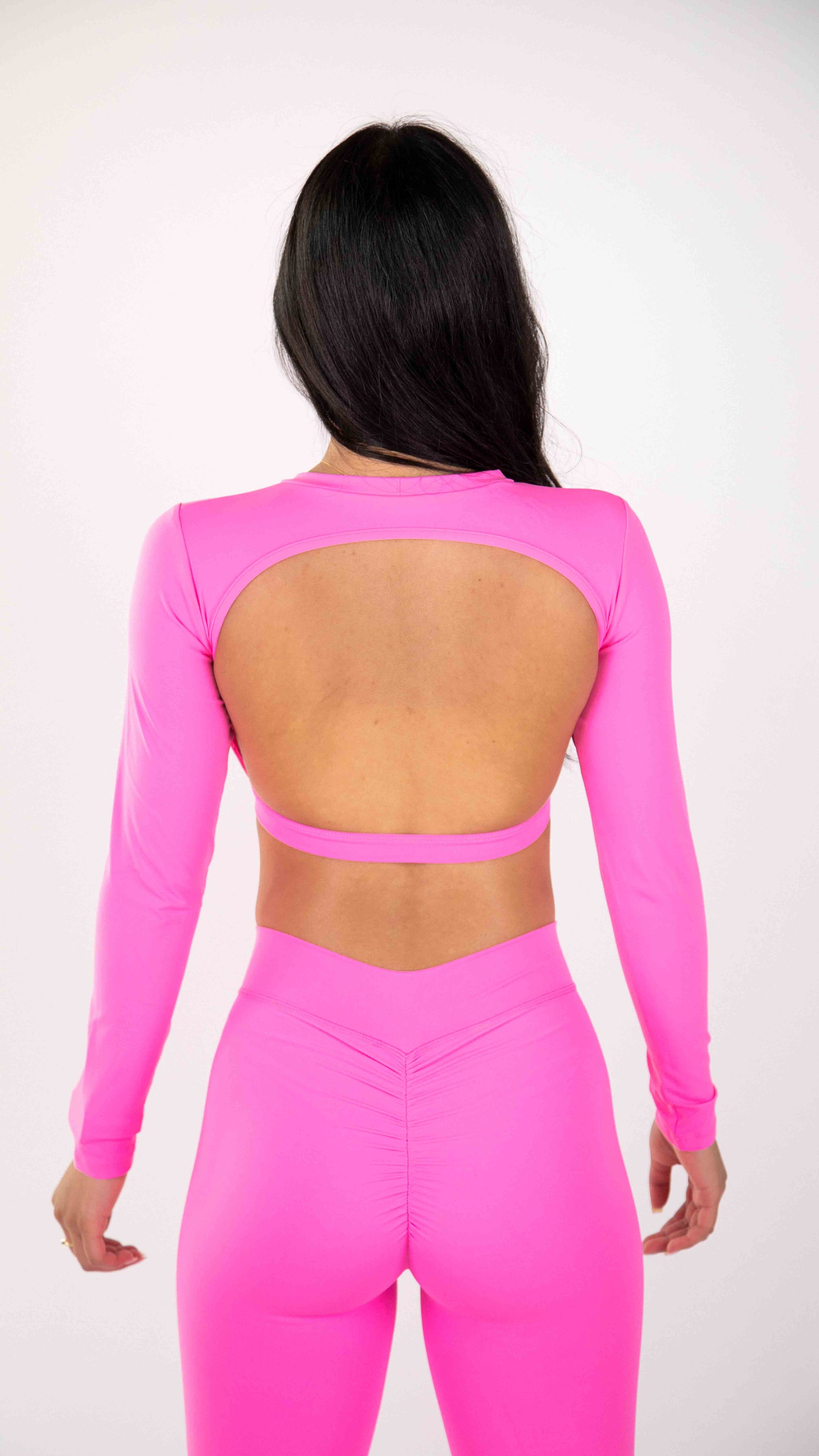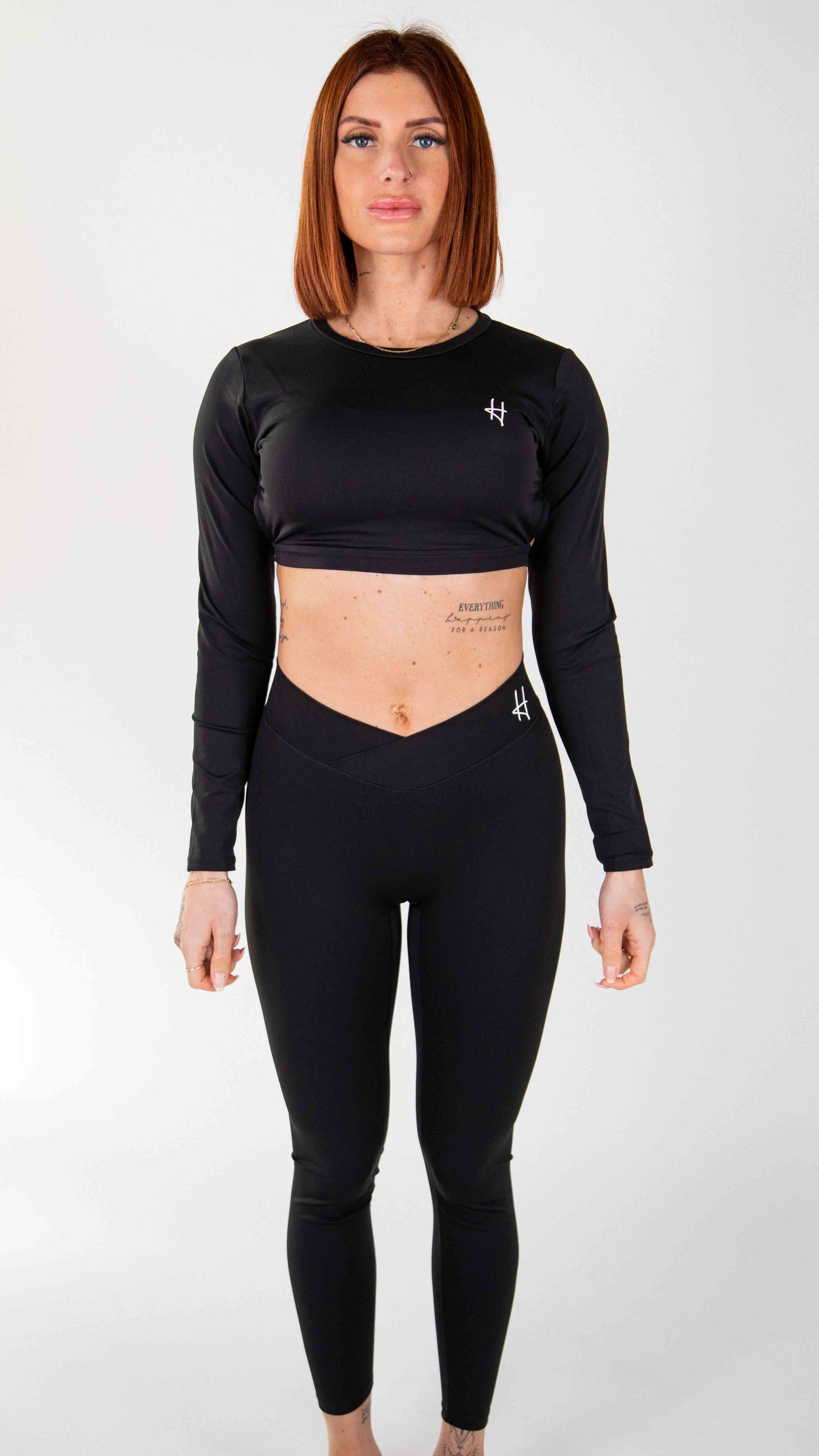Découvrez l'ensemble Lina, parfait équilibre entre sophistication et performance. Ce modèle noir intemporel comprend un haut court ajusté à manches longues qui se démarque par une élégante ouverture au dos, ajoutant une touche d'audace tout en subtilité. Le legging taille haute en V avec finition froncée à l'arrière épouse délicatement vos courbes pour une silhouette raffinée et élancée.